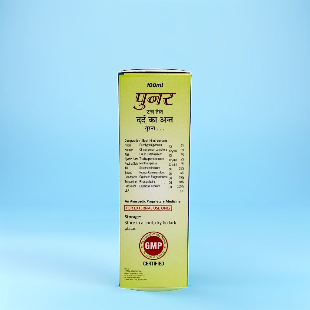 Punar Touch Pain Oil is a potent Ayurvedic solution designed to provide quick and effective relief from various types of body pain. This specially formulated oil harnesses the healing properties of natural ingredients to target pain and inflammation, offering soothing comfort. Ideal for use on sore muscles, joints, and other areas of discomfort, Punar Touch Pain Oil is a must-have for anyone seeking natural pain management.